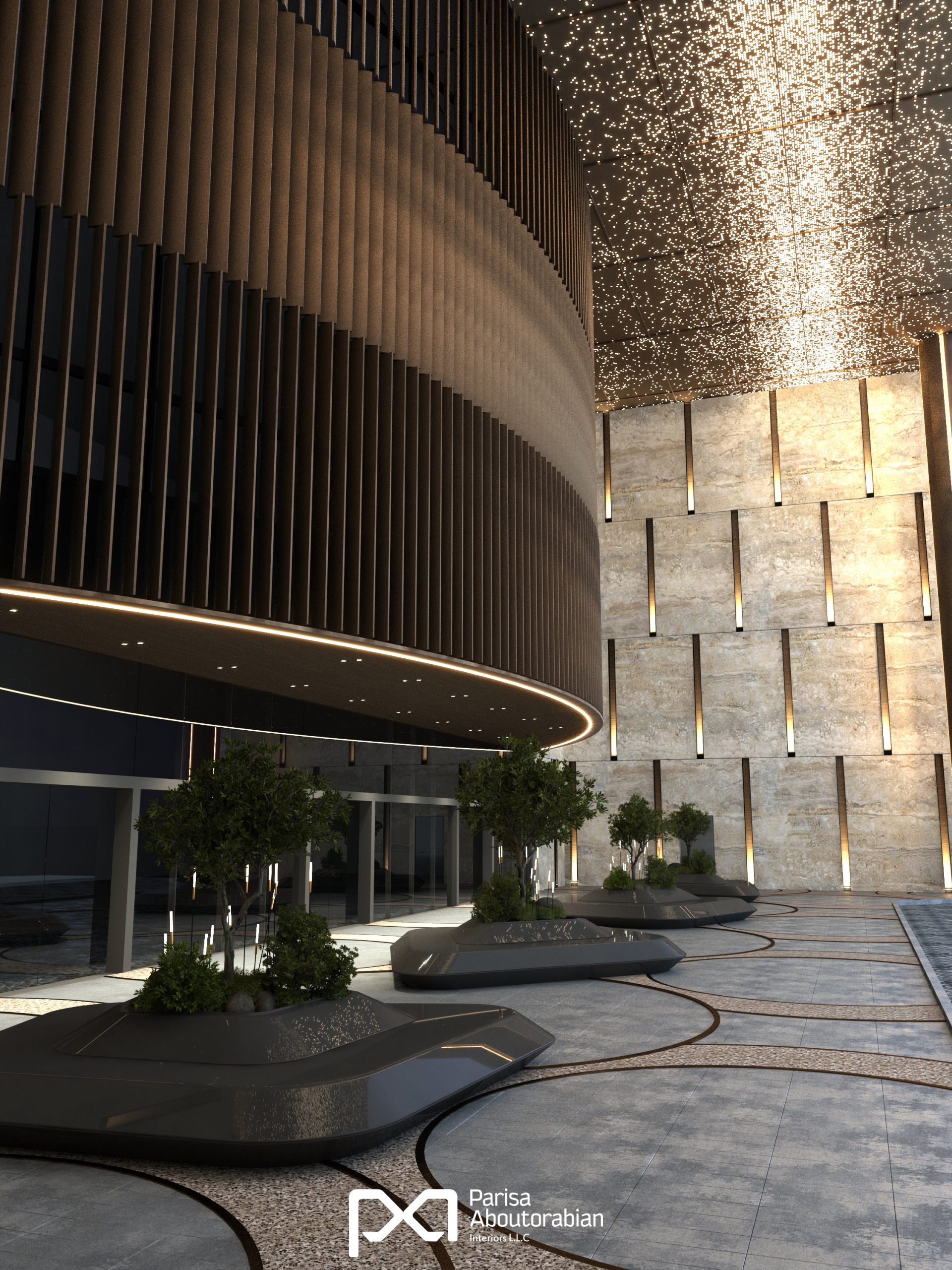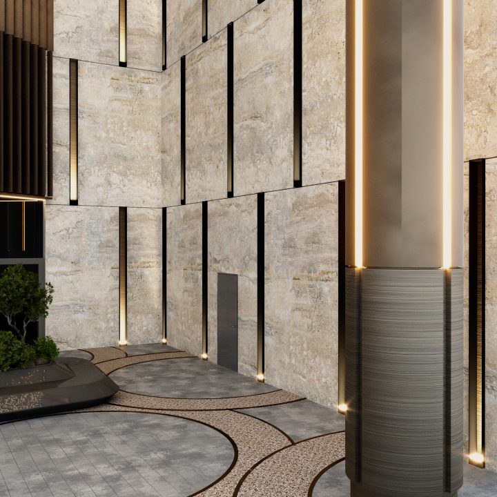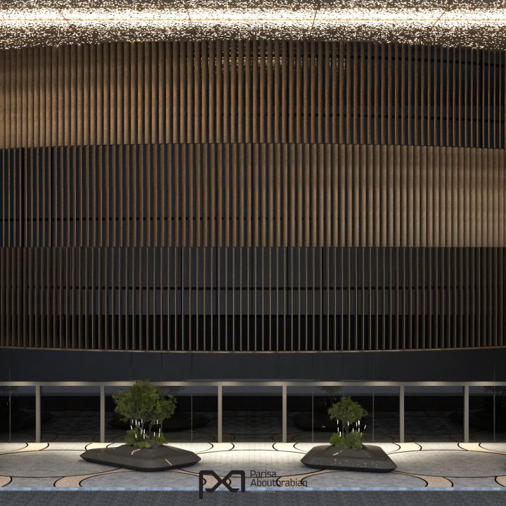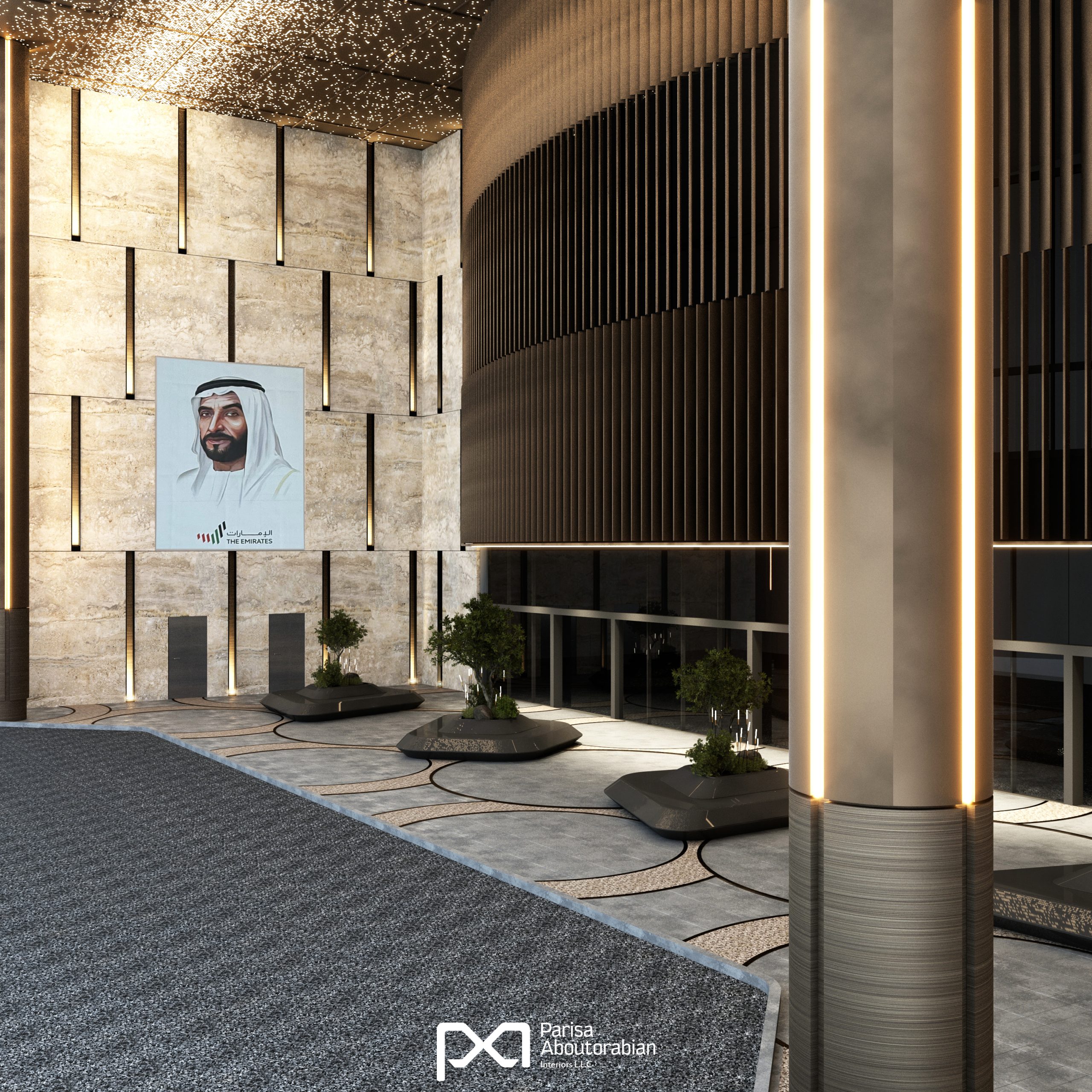 The renovated entrance of Mushrif Mall in Abu Dhabi blends luxury and functionality, featuring elegant stone finishes, a star-patterned bronze ceiling, and bespoke lighting that create a striking first impression. Durable carpet stone flooring complements the space, while unique sculptural benches with integrated greenery provide inviting seating, offering a sophisticated and welcoming experience for every visitor.