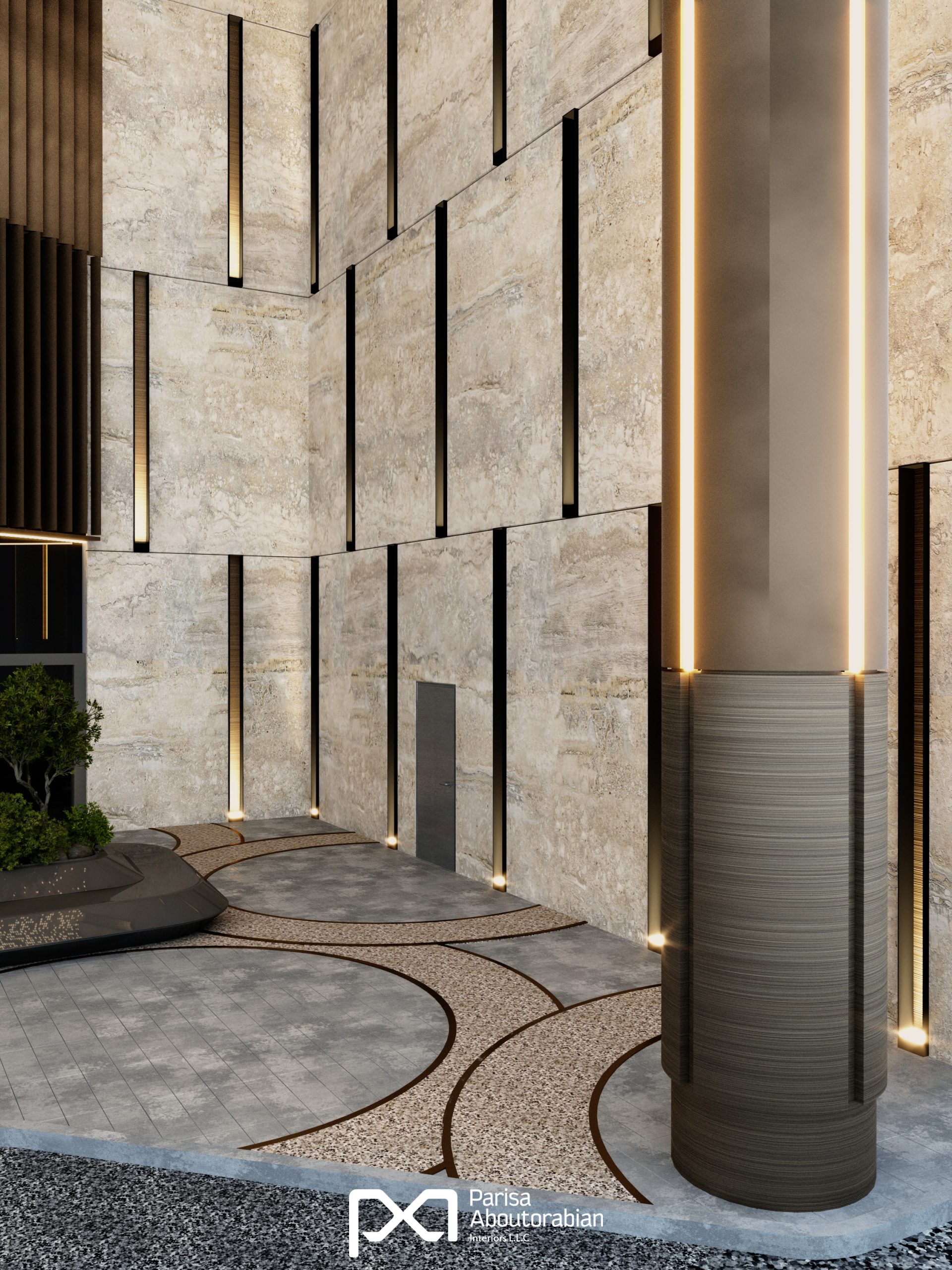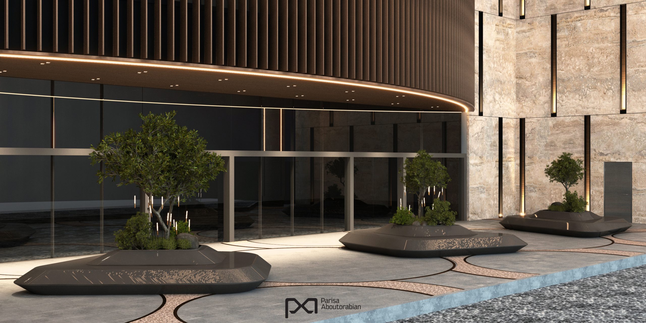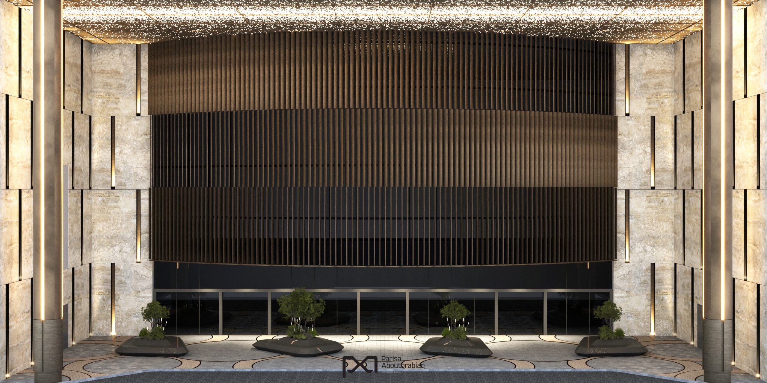 The renovated entrance of Mushrif Mall in Abu Dhabi blends luxury and functionality, featuring elegant stone finishes, a star-patterned bronze ceiling, and bespoke lighting that create a striking first impression. Durable carpet stone flooring complements the space, while unique sculptural benches with integrated greenery provide inviting seating, offering a sophisticated and welcoming experience for every visitor.