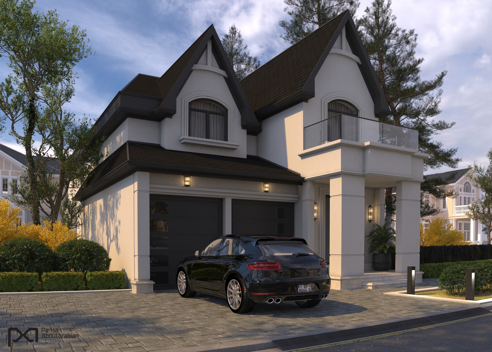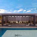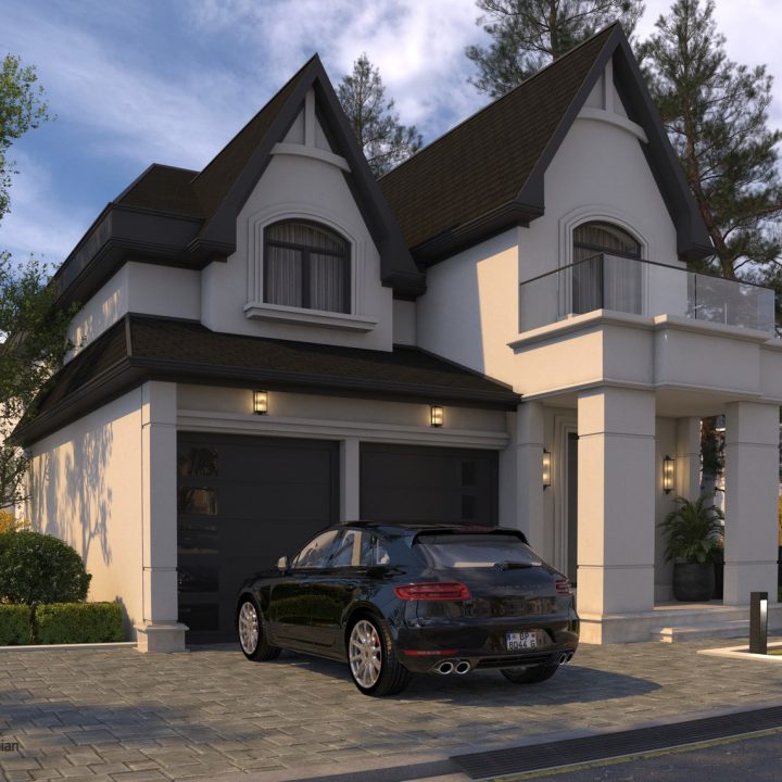 This facade design for a private villa features a striking contrast of crisp white surfaces with bold black accents. The sleek, black sloped ceiling and matching black window frames create a sophisticated and modern look, enhancing the villa’s elegant profile. The clean lines and minimalist color palette highlight the architectural beauty and make a bold, stylish statement.